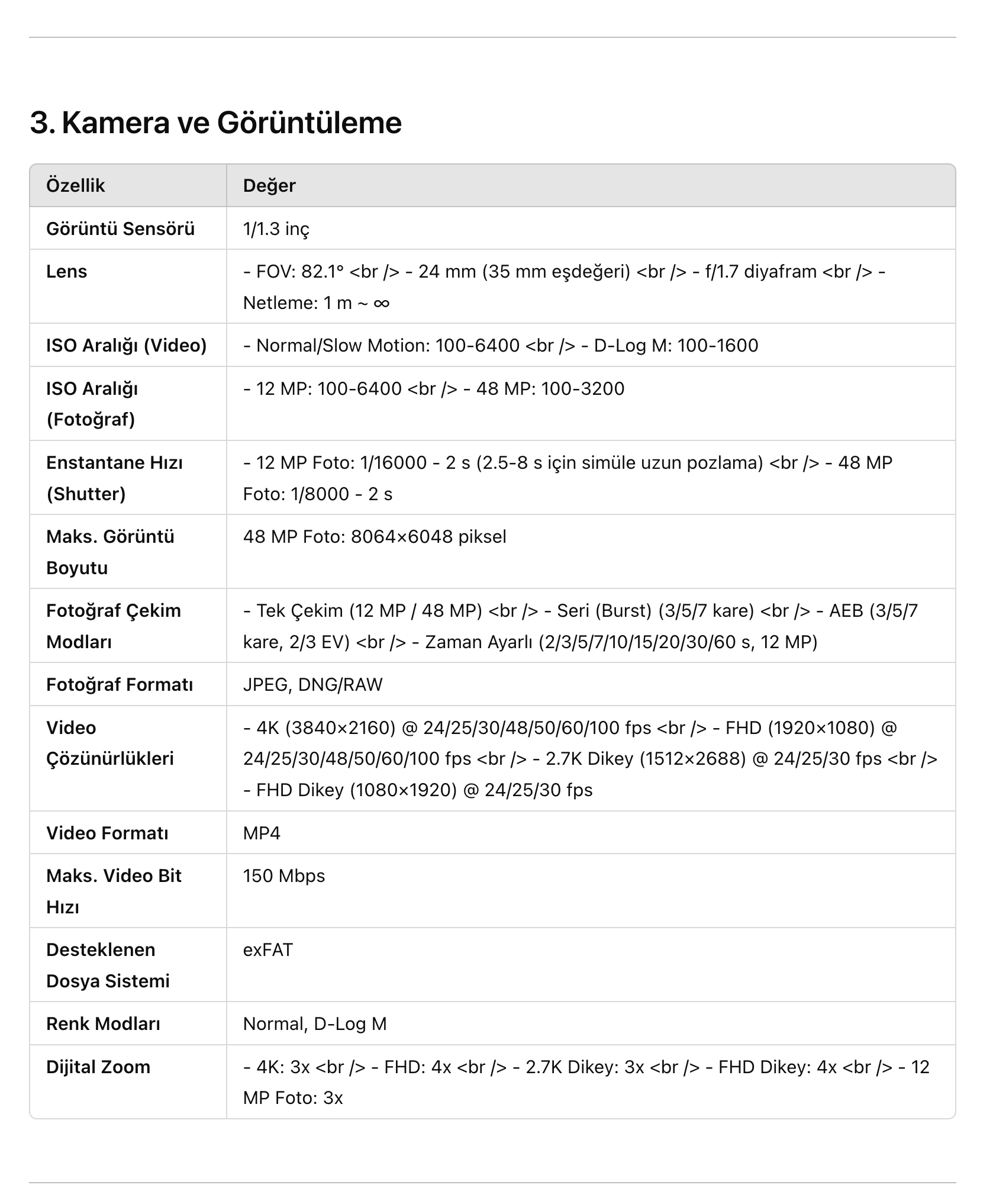1. Güçlü Kamera Donanımı: DJI Flip, 1/1.3 inç CMOS sensörle donatılmış kamerasıyla 4K/60 kare video ve 4K/100 kare ağır çekim (slow-motion) videolar çekebiliyor. Fotoğraf tarafında ise 48 MP çözünürlük sunuyor. Aynı zamanda 10-bit D-Log M, Dual Native ISO, HDR görüntüleme ve sosyal medyaya uygun 2.7K dikey çekim (vertical crop) gibi ileri seviye özellikler de mevcut.